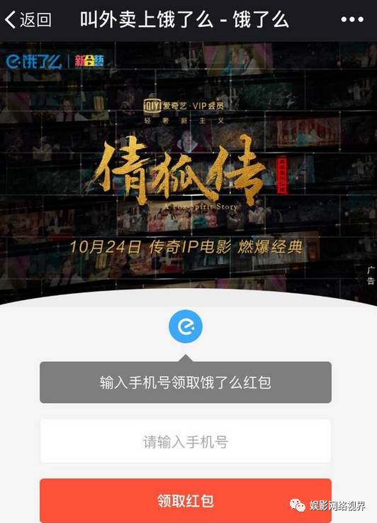 还联手多家平台联合举办线上活动。比如,针对网大的年轻受众,在美食类app“饿了么”上推出“倩狐传爱奇艺vip送红包”活动;