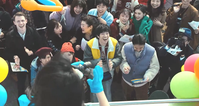 村西在街头吹嘘他的情色能拯救日本时,前拥后簇,挤到最前方,笑着拍手的学生还高喊着: