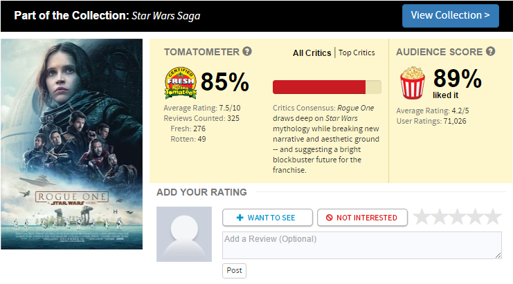 猫眼电影讯 由加里斯·爱德华斯执导,菲丽希缇·琼斯、迭戈·鲁纳、甄子丹、本·门德尔森、麦斯·米科尔森、艾伦·图代克、福里斯特·惠特克、姜文、里兹·阿迈德等人主演的《星球大战外传:侠盗一号》将于北京时间1月6日在内地影院上映。此前该片已于2016年12月16日在北美公开上映。目前,北美地区媒体及观众评分已经出炉,总体来看,这部影片收获口碑不错,满足了大部分星战影迷们对星战外传的期待。