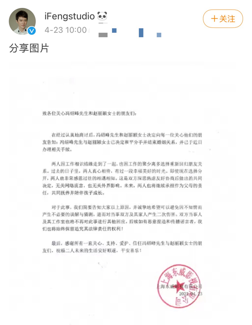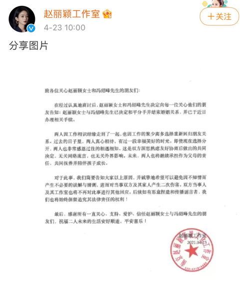 赵丽颖和冯绍峰双方工作室都出来发表声明,两人是和平分手并且已经办理了相关手续,希望网友不要过度猜测。