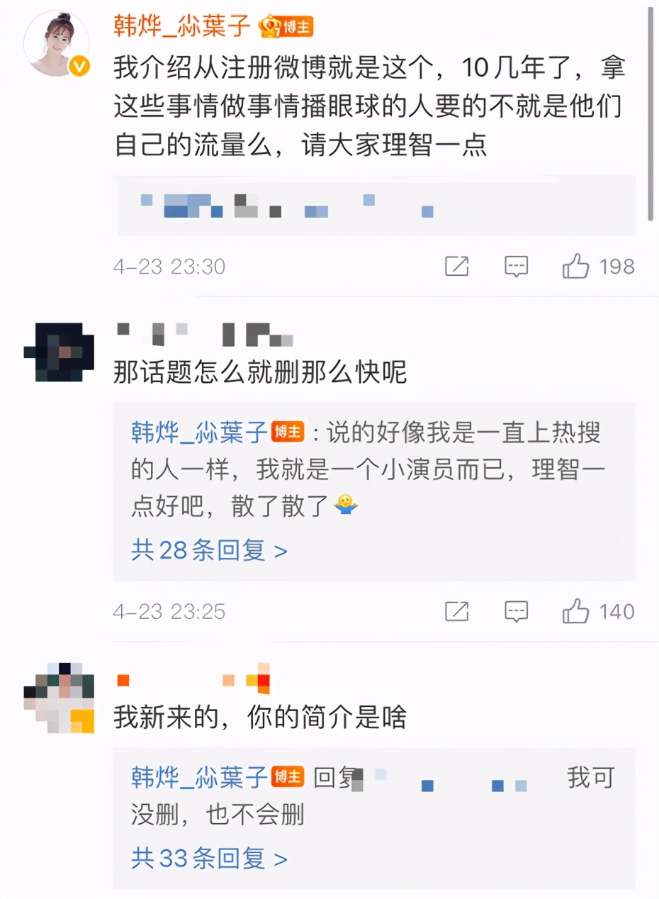 韩烨也在评论区里一直解释希望大家能够理智一点,许多网友相信韩烨并且帮助韩烨一起解释并且也希望大家不要过度揣测明星,理智吃瓜。