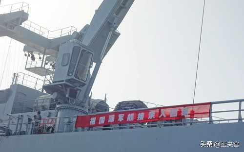 军舰上的横幅——“祖国派军舰接亲人回家”