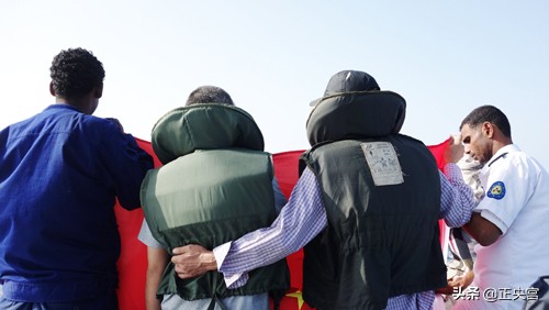 秦队长掏出一面五星红旗,四个人用身体将红旗展开铺平,通过电话与舰上联络,红旗在海风中猎猎招展,而我们早已眼眶湿润。