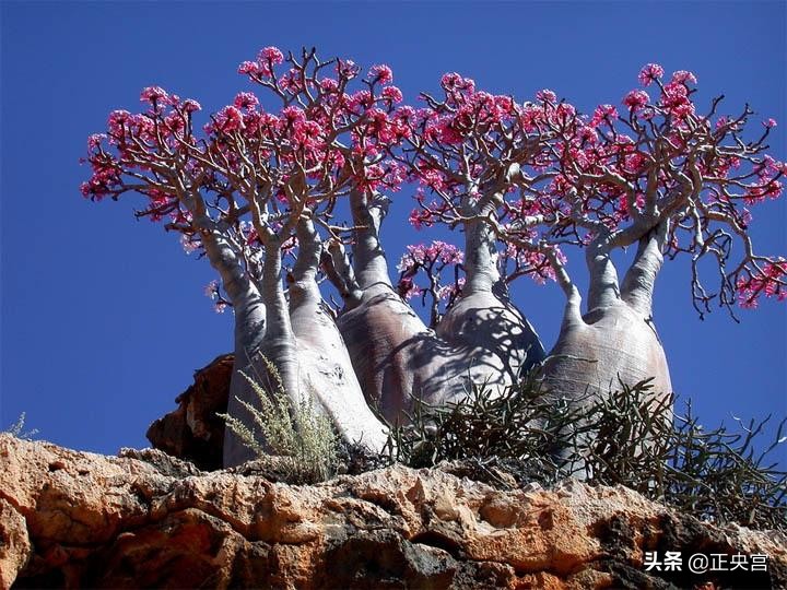 外型非常符合外星生物的形象,与其在非洲和阿拉伯大陆的近亲不同。它粗粗短短的的外型适合抵挡季侯风。在悬崖上出现的“沙漠玫瑰”相当特别,直接嵌进石头长出来,完全不需要土壤,树皮像橡胶一样闪闪发亮,枝干顶端长出漂亮的粉红色花朵。