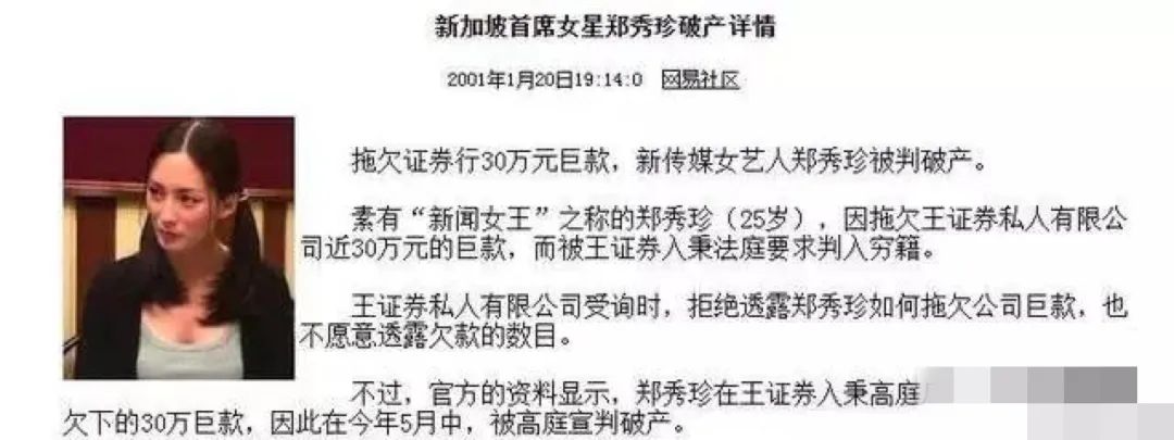 破产的郑秀珍被法院判入“穷籍”,生活上遭受政府的诸多限制,成为新加坡第一个破产的女星。
