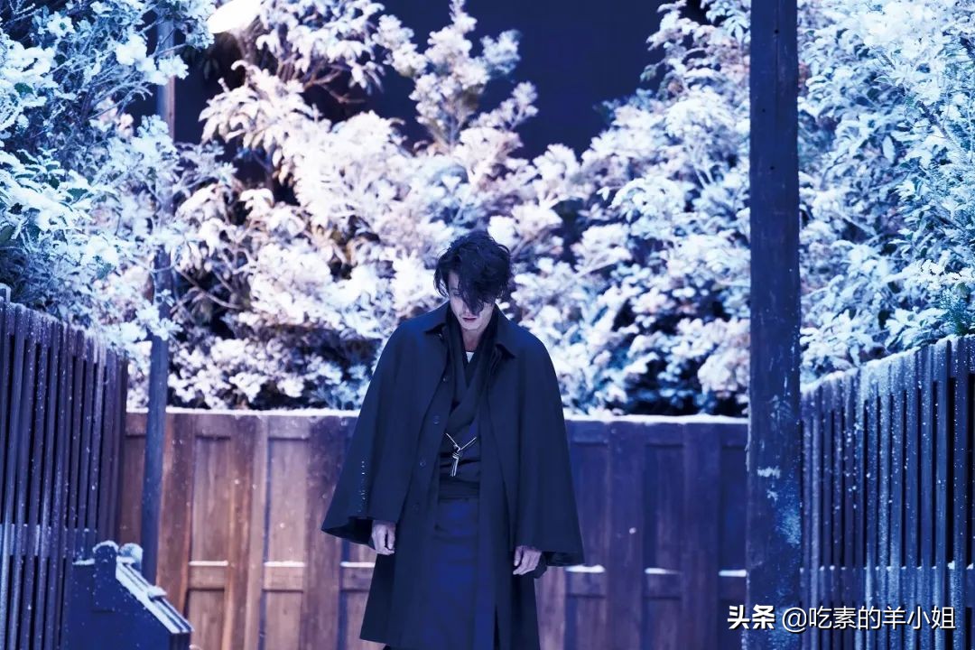 离死亡越近,太宰治生命中的色彩就越少,接近尾声他一个人走在无人的街上,背景是纷纷飘落的雪花,看不见太宰治的脸,只能感觉他越发接近天的黑色,成了幕布中的剪影。