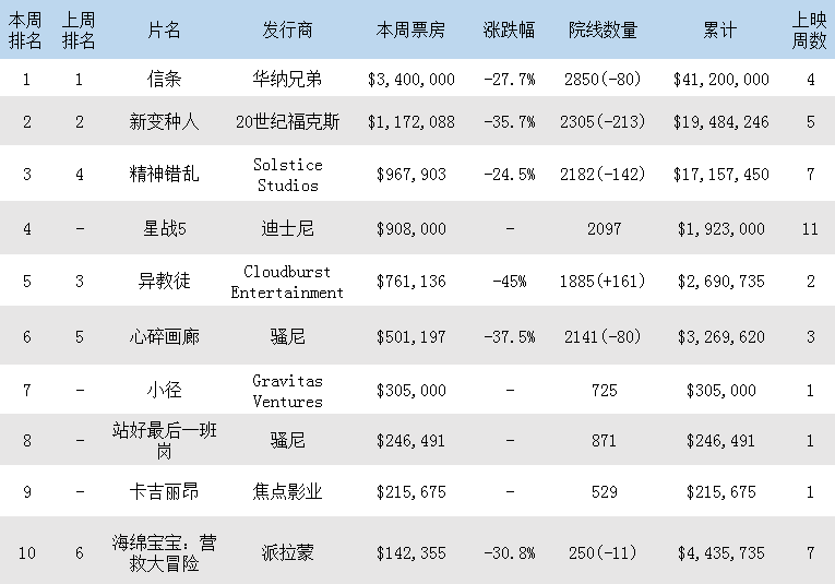 第五名是《异教徒》,本周收入76.1万,下跌45%,累积269万。该片未在海外上映。