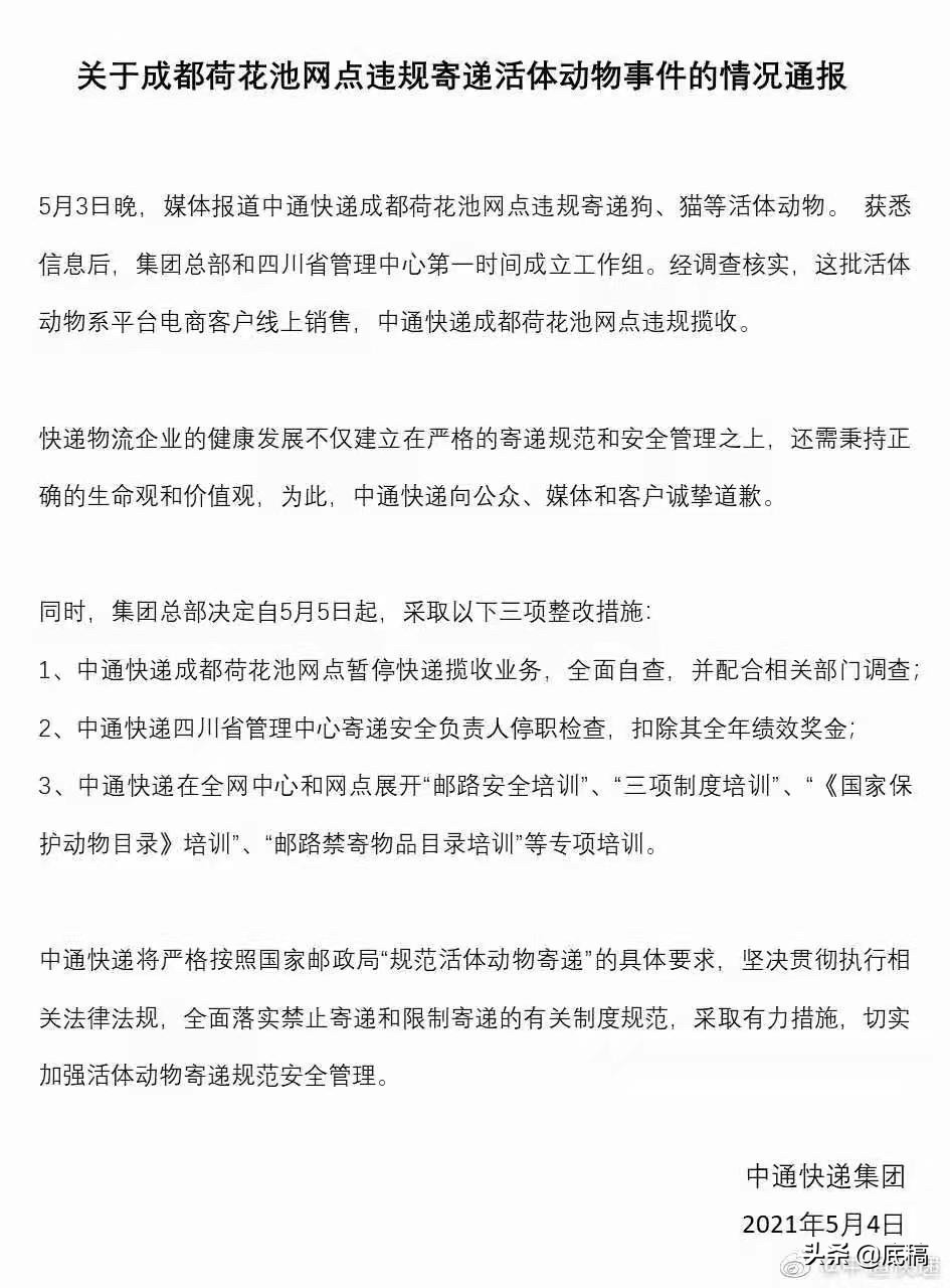 目前,涉事企业中通快递已公开发声,称运输点违规揽收活体动物。邮政、农业等相关监管部门正介入此事调查中。而被救下的动物也被安置在成都市新都区石板滩宠物城,等待下一步处理。