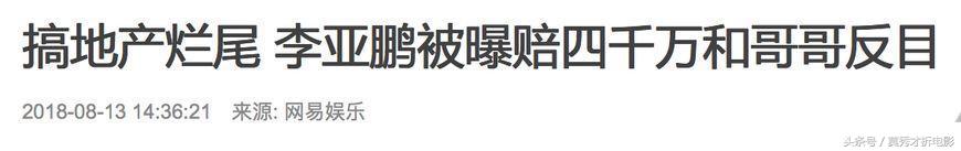 8月13日,媒体曝出李亚鹏搞房地产烂尾,一分不赚反赔4000万的消息。不仅赔钱,他还因生意经营问题与哥哥李亚伟产生分歧,两人已分道扬镳多年。看着人家王菲和谢霆锋恩恩爱爱,孤身一人面对失败的李亚鹏着实令人唏嘘。